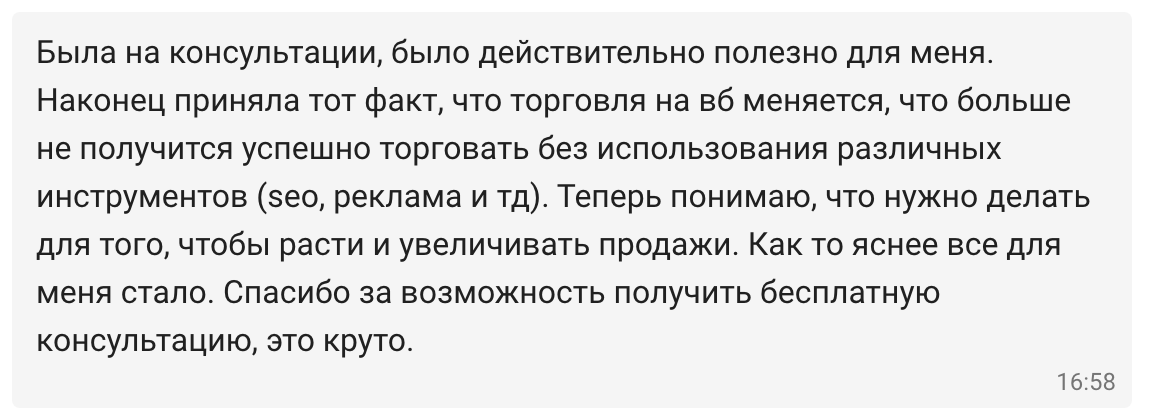 В общем с Дмитрием понравилось работать, все четко, по делу, с примерами и разными важными деталями, которые могут помочь самостоятельно на должном уровне создавать карточки, делать фото и редактировать их. Было очень полезно ☺️