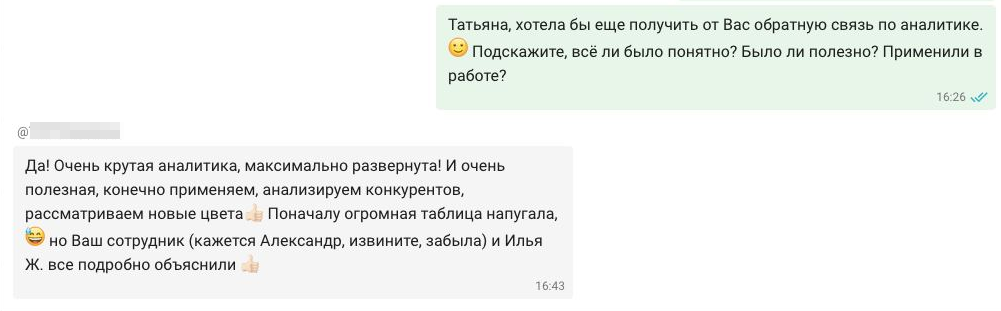 Да! Очень крутая аналитика, максимально развернута! И очень полезная, конечно применяем, анализируем конкурентов, рассматриваем новые цвета 👍🏻 Поначалу огромная таблица напугала, 😅 но Ваш сотрудник (кажется Александр, извините, забыла) и Илья Ж. все подробно объяснили 👍🏻