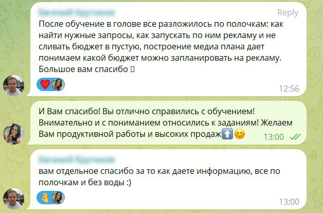 После обучение в голове все разложилось по полочкам: как найти нужные запросы, как запускать по ним рекламу и не сливать бюджет в пустую, построение медиа плана дает понимаем какой бюджет можно запланировать на рекламу. Большое вам спасибо