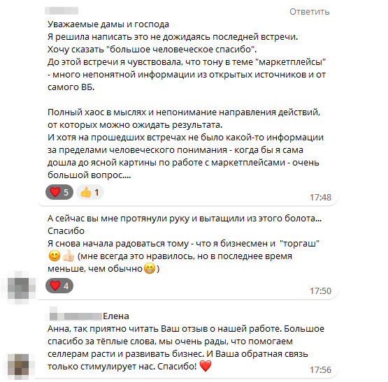 Уважаемые дамы и господа Я решила написать это не дожидаясь последней встречи. Хочу сказать "большое человеческое спасибо". До этой встречи я чувствовала, что тону в теме "маркетплейсы" - много непонятной информации из открытых источников и от самого ВБ.