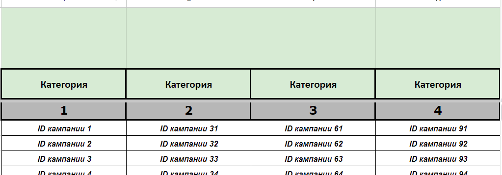 Ваши рекламные кампании на маркетплейсах имеют идентификационный индивидуальный номер ID, их также необходимо разбить по категориям, чтобы корректно учитывать расход на внутреннее продвижение в каждой категории. Занесите ID кампаний под нужной категорией, переименуйте название категории, для удобства.