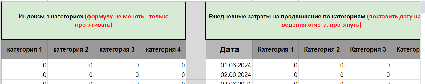 Дата начала ведения рекламного отчета. Занесите в таблицу дату начала ведения отчета или дату, с которой хотите отслеживать данные по затратам на внутреннее продвижение , в шаблоне указана дата 1 июня, ее можно изменить и протянуть вниз.