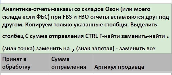 В кабинете селлера: Аналитика - Отчеты -Заказы (здесь выбираете: с моих складов или со складов Озон) При работе по 2 схемам нужно скачивать оба отчета и вставлять их друг по другом. В Excel файле необходимо оставить нужные столбцы с названиями принят в обработку, сумма отправления, артикул продавца и вставить их строго под этими названия в листе “Кабинет озон”.