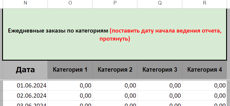 Дата начала ведения отчета. Занесите в таблицу дату начала ведения отчета или дату, с которой хотите отслеживать данные по заказам и продажам, в шаблоне указана дата 1 июня, ее можно изменить и протянуть вниз.