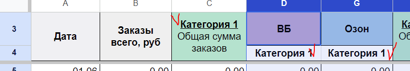 Вам необходимо переименовать категории аналогично распределению на листах ВБ и Озон в шапке таблицы.