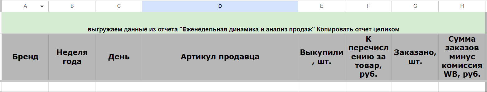 В кабинете селлера: Аналитика - Отчеты - Еженедельная динамика и анализ продаж, выбираем нужную дату или диапазон дат, скачиваем Excel файл и копируем отчет целиком, вставить необходимо строго под ячейками.