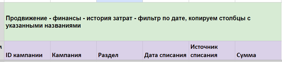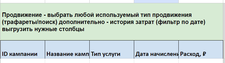Необходимы аналогичные действия, что и на листе реклама ВБ, занесите ID кампаний под нужной категорией и введите дату начала ведения отчета по затратам на маркетинговое продвижение внутри маркеплейса.