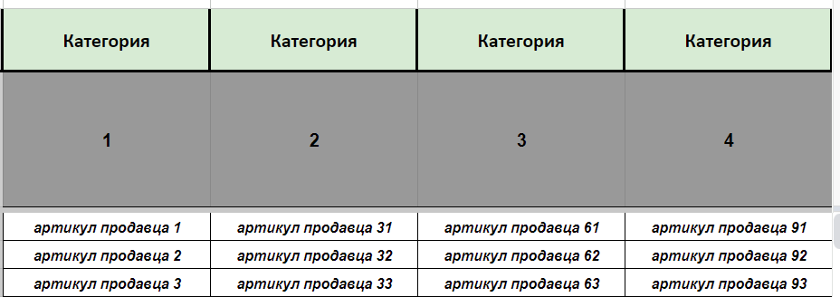 Протяните бегунок вправо до конца. Таблица с категориями. Разбейте Ваш ассортимент на категории, назовите для удобства каждую (пример: платья - это категория 1, аксессуары - категория 2, обувь - 3 и т.д.) Занесите нужные артикулы под каждой категорией (необходимо указывать строго артикул продавца, можно найти его в отчете по перечню номенклатур).